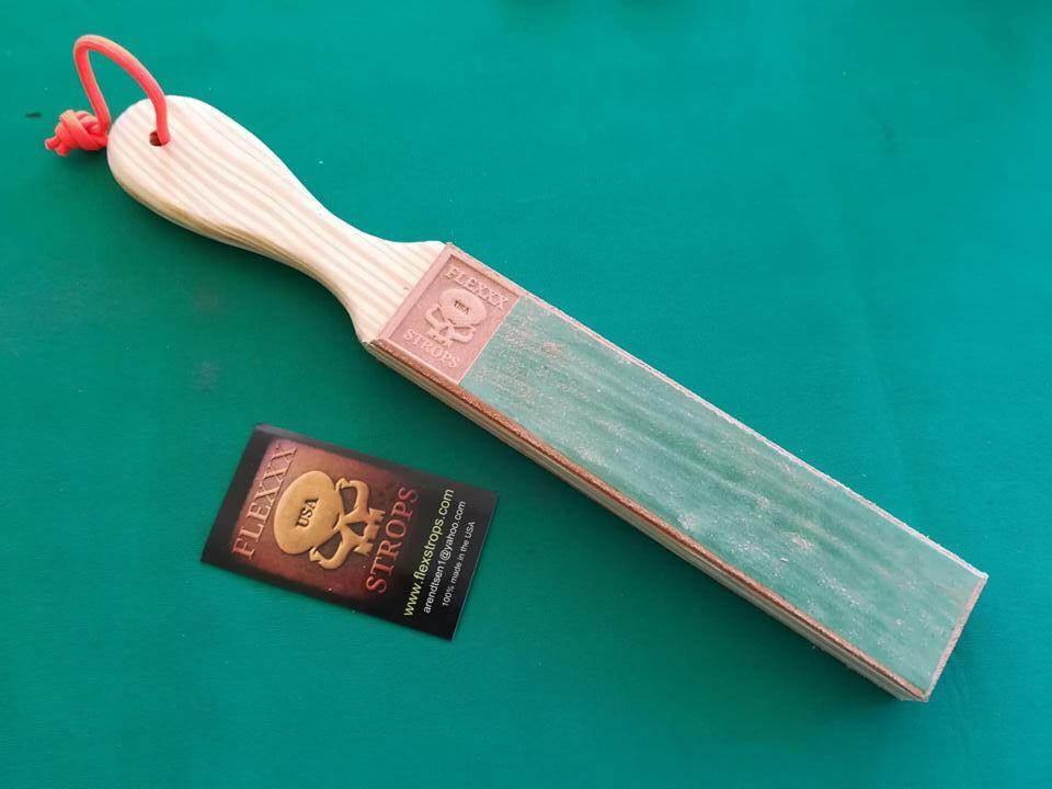 Affilatore Coramella Flex Strops FLX04 affila lame coltelli Rudis Paddle Strop, base in legno con manico, cordicella e doppio lato per affilatura. Superfici in pelle. Dimensioni superfici affilanti 38.5×7.2cm. Lunghezza totale 55.5cm, spessore 3cm. Affila qualunque lama compreso i machete. Made in USA.rif scat s