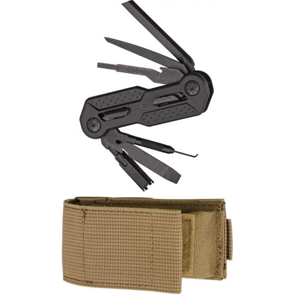 Attrezzo multiuso eFECT II AR-15 30-001025 Gerber. Lunghezza totale 11,9 cm. Costruzione in acciaio in finitura nera. Include raschietto piatto, raschietto. Componenti intercambiabili: spazzola di nylon sottile Otis, e picchetto Otis curvo. Saf-T-Lok brevettato. Fodero in nylon coyote tan.rif. scat. 4
