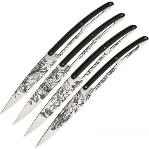 Coltelli da cucina Deejo DEE4AS020 Set Blossom knife messer couteau navaja, set di quattro coltelli di 23cm, lama di circa 10.8 in acciaio Z40C13 con finitura a specchio e decorazione a motivi floreali. Full Tang. Manico in Paperstone nero.rif scat 19