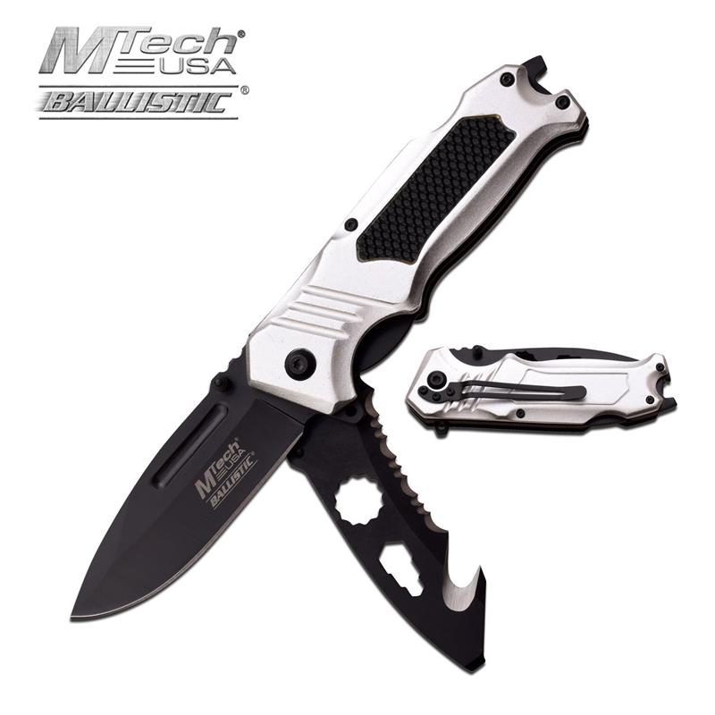 Coltello Dual Blade Chiudibile A/O MTA914SL Mtech. 11,9 cm chiuso. goccia di 8,65 cm nero finitura acciaio inox apertura assistita punto lama con vite prigioniera pollice e tang estesa con fori di ancoraggio. Caratteristiche secondo 8,65 centimetri nero finitura lama multi-strumento inox seghettata con perno di pollice. Maniglie in alluminio con inserto in caucciù nero e apribottiglie integrato finitura argento. Clip da tasca in acciaio inox.Lunghezza totale 11,9 cm chiuso, lunghezza lama 8,6 cm. Lama acciaio inox a punta di goccia apertura assistita finitura nera con perno per il pollice.Include una seconda lama di lunghezza 8,6 cm acciaio inox seghettata multistrumento con perno per il pollice. Manico in alluminio nero con inserti in caucciù nero. Apribottiglie finitura argento. Clip da tasca in acciaio inox.