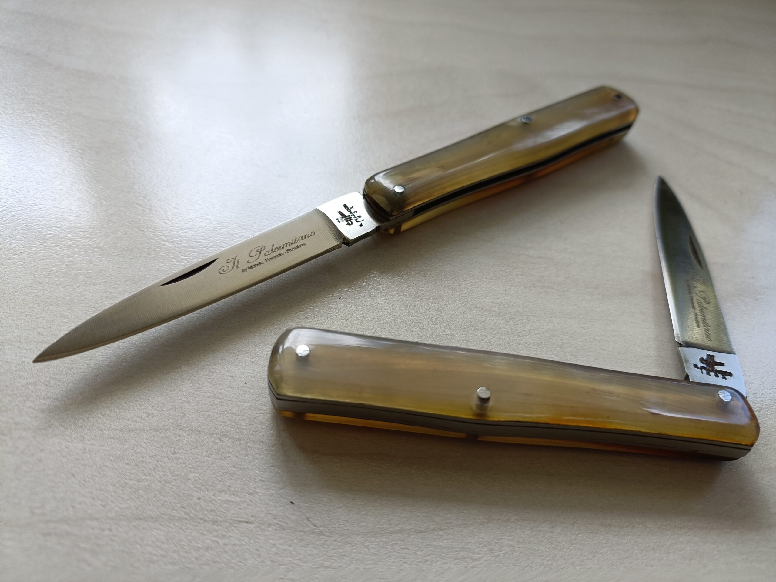 Coltello Tradizionale Palermitano 0403/915. Lunghezza totale 15cm, lama liscia di 6cm in acciaio inox 420. Manico in corno bovino naturale. Chiuso misura 8cm. Essendo il legno un materiale naturale le sfumature e il colore possono cambiare da coltello a coltello, pertanto le foto sono puramente indicative. Realizzato artigianalmente dalla coltelleria Michele Fraraccio di Frosolone