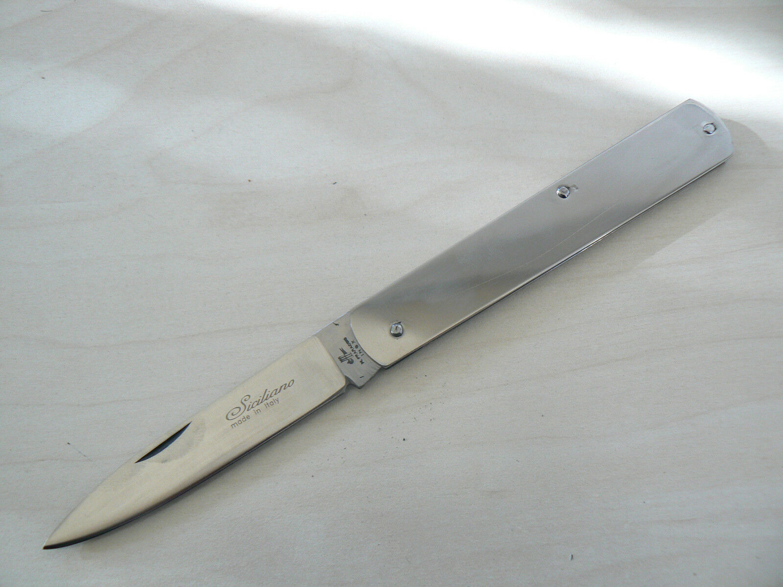 Coltello tradizionale Sfilato Siciliano manico acciaio lucido 0559/101.Lunghezza totale 17cm, lama liscia di 7cm in acciaio inox 420. Chiuso misura 9.5cm. Manico in acciaio lucido. Realizzato artigianalmente dalla Coltelleria Michele Fraraccio di Frosolone