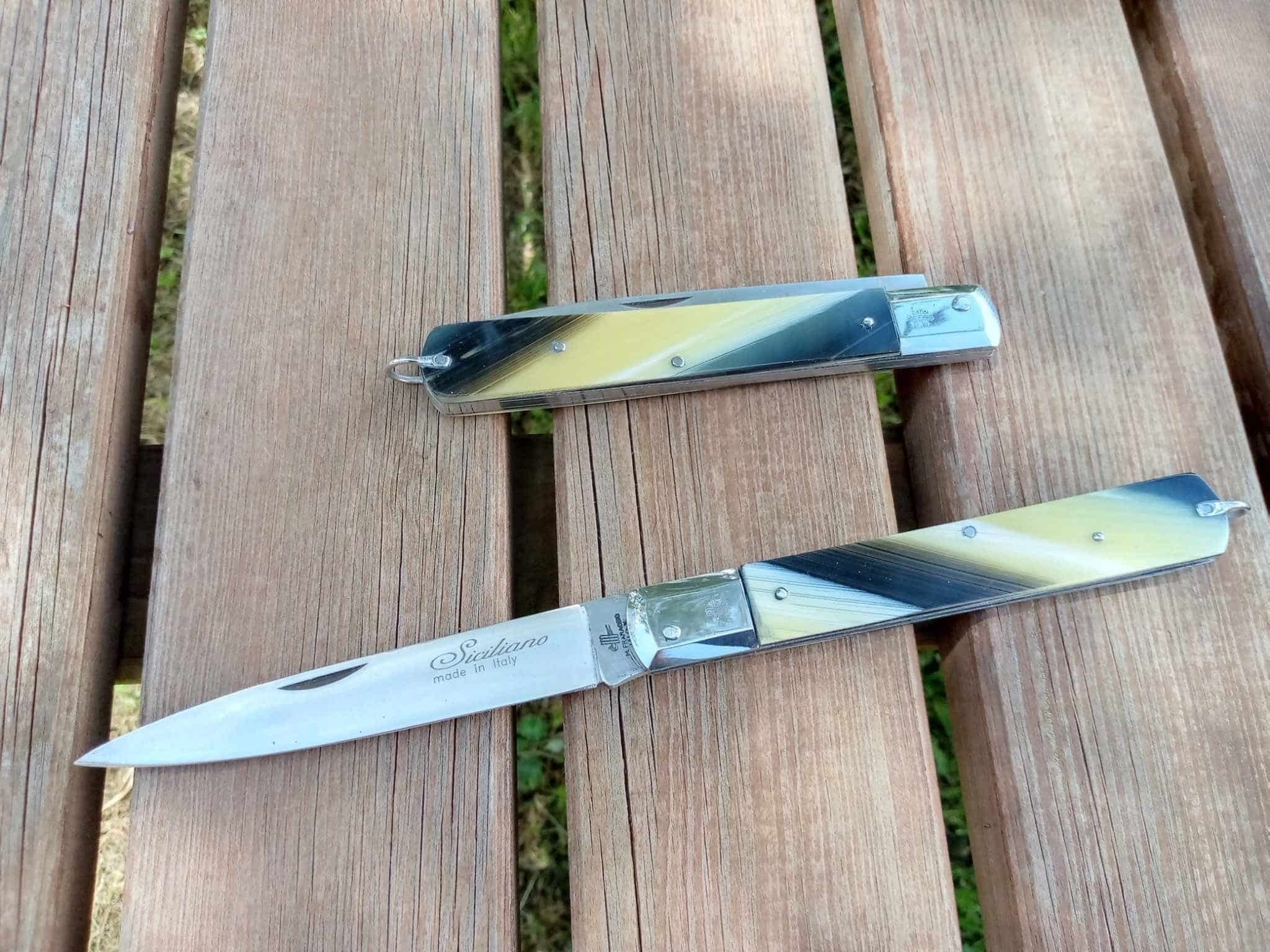 Coltello Sfilato siciliano testina acciaio 28 cm finto corno knife couteau 0596/414-28. Lunghezza totale 28cm, lama liscia di circa 12 cm in acciaio inox 420 con testina inox, manico in finto corno con anello posteriore. Chiuso misura 15cm. Realizzato artigianalmente dalla coltelleria Michele Fraraccio di Frosolone