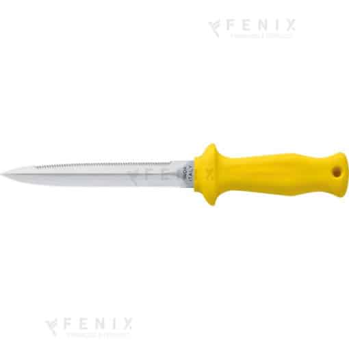 Dotato di lama doppia con filo liscio e seghettato, e di un manico giallo fluorescente, è facilmente visibile anche in condizioni di scarsa luce o acqua torbida 💡🌊.