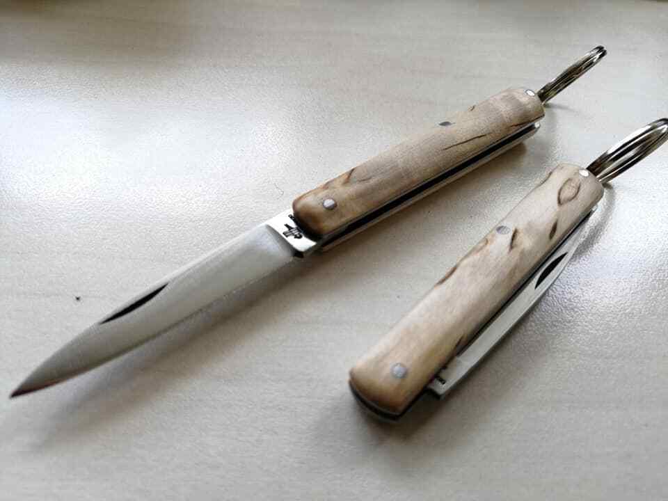 Coltello Tradizionale mini sfilato betulla 12cm couteau navaja knife messer, 0399/530-12BE. Lunghezza totale 12 cm, lama liscia di 5 cm in acciaio inox 420. Manico in legno di betulla con anellino posteriore per utilizzare il coltellino come portachiavi. Chiuso misura 7cm. Essendo il legno un materiale naturale, il colore e le sfumature variano da coltello a coltello, pertanto le foto sono puramente indicative. Realizzato artigianalmente dalla coltelleria Michele Fraraccio di Frosolone