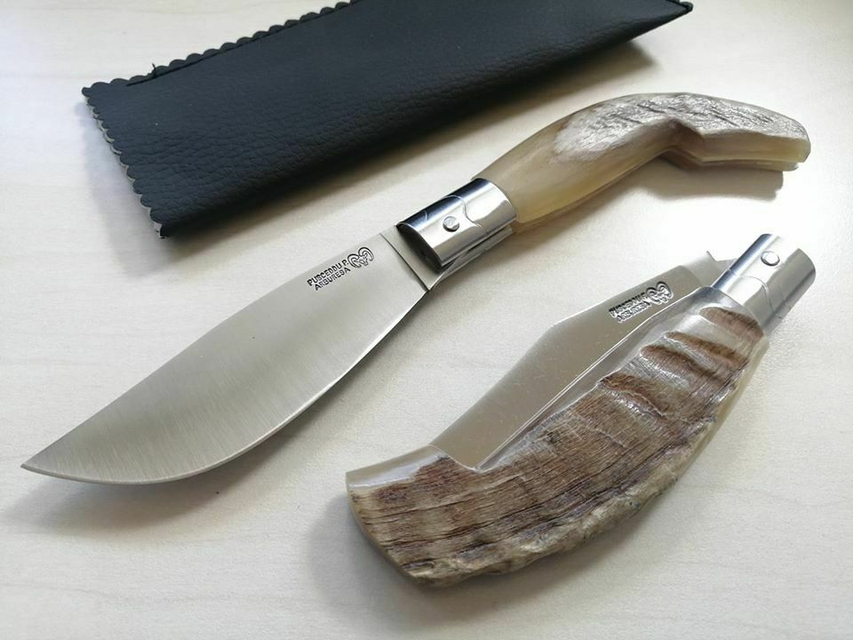 Coltello Tradizionale Pattada Pusceddu Arburesa punta di montone couteau knife, 0602/075. Lunghezza totale 20 cm circa, lama liscia di 9 cm in acciaio inox 420. Manico in corno punta di montone. Foderino in velluto