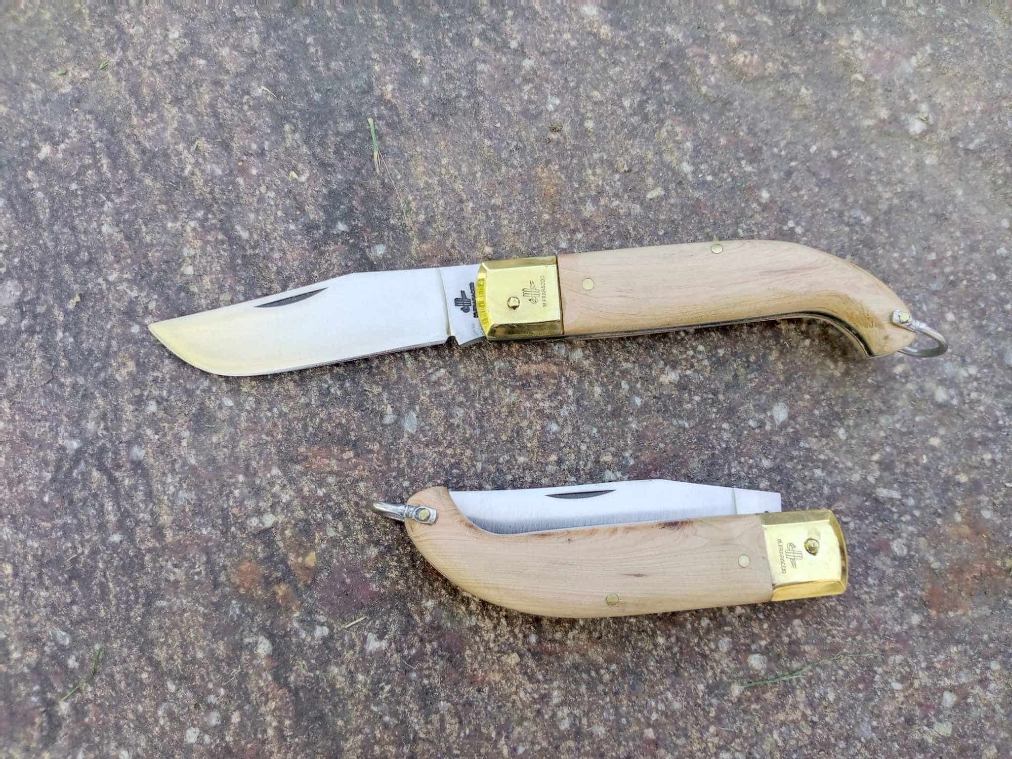 Coltello Tradizionale Scarperia manico legno di Ginepro 0398/506-1Gi. Lunghezza totale 17.5 cm circa, lama liscia di 7 cm in acciaio inox 420 con testina in ottone. Chiuso misura 10cm. Manico in legno di Ginepro con anello posteriore.Essendo il legno un materiale naturale, il colore e le sfumature variano da coltello a coltello, pertanto le foto sono puramente indicative. Realizzato artigianalmente dalla coltelleria Michele Fraraccio di Frosolone