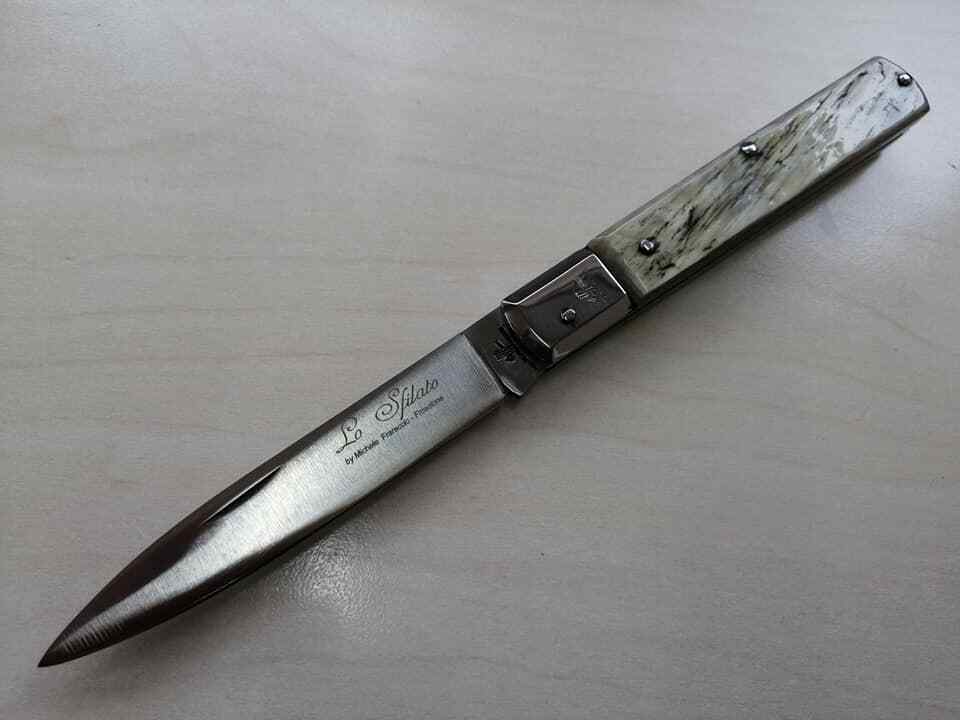 Coltello Tradizionale Sfilato 19 cm corno antico Frosolone couteau navaja knife 0412/414-19. Lunghezza totale 19 cm circa, lama liscia di 8.00 cm in acciaio inox 420, con testina in acciaio lucido. Manico in corno naturale antico.