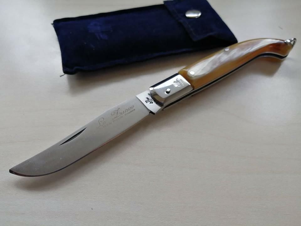 Coltello Tradizionale Zuavo manico corno Frosolone couteau navaja knife, 0408/470-19. Lunghezza totale 19 cm, lama liscia di 8 cm in acciaio inox 420 con testina in acciaio. Manico in corno bovino naturale chiaro con anello posteriore. Chiuso misura 10.5cm. Essendo il corno un materiale naturale, il colore e le sfumature variano da coltello a coltello, pertanto le foto sono puramente indicative. Realizzato artigianalmente dalla coltelleria Michele Fraraccio di Frosolone
