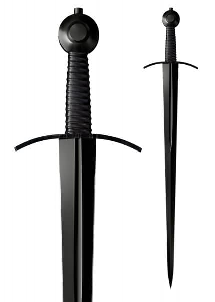 Spada MAA Arming 88ARM Cold Steel. Lunghezza totale 87,9 cm, lunghezza lama 71 cm. Lama acciaio ad alto carbonio 1090 finitura nera. Manico in pelle nera con finitura in acciaio nero e pomello tondo. Fodero in pelle nera con finiture in acciaio con finitura brunita.