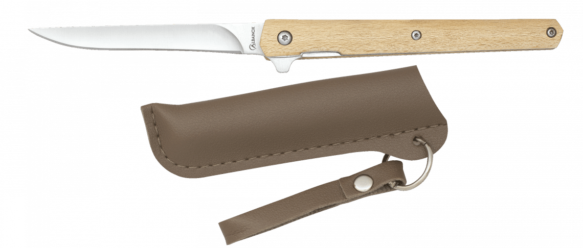 manico in legno chiaro. Foderino in similpelle marrone con anello portachiave