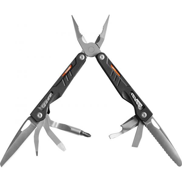 Pinza multitool MP1 30-001009 Gerber. Lunghezza totale 17,7 cm. Costruzione acciaio inox. Include pinze, seghetto in legno, taglierino, 3 cacciaviti, apribottiglie. Fodero in nylon.rif scat 17
