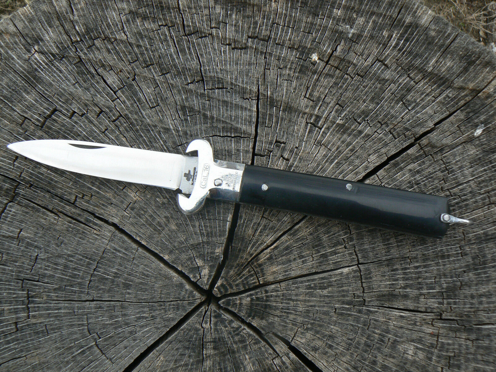 Coltello tradizionale Caccia, lunghezza totale 28cm, lama liscia di 12cm in acciaio inox 420 con testina inox ed estrattori calibro 12 e 16. Manico in ABS nero con anello posteriore. Chiuso misura 15.5cm. Realizzato artigianalmente dalla Coltelleria Michele Fraraccio di Frosolone.