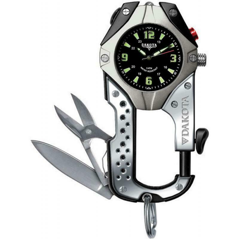 Orologio Dakota DK8761 Orologio Dakota Clip Watch. Cassa in alluminio con finitura nera e inossidabile. L’orologio ha un quadrante nero e lancette e indici luminosi. Seconda mano. Movimento al quarzo giapponese. LED rosso. Bussola integrata montata lateralmente. Resistente all’acqua fino a 30 mt. Lama e forbici in acciaio inossidabile. Clip di fissaggio e portachiavi. Custodia in metallo.rif scat d