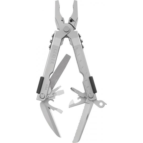 Pinze Blunt Nose MP600 07505G Gerber. Manico e attrezzi con finitura nera. Pinza, taglia filo, crimpatore, scala metrica e standard, linguetta per laccetto, cacciavite phillips,apribottiglie, apri scatole, lama seghettata, cacciavite piatto grande, medio e piccolo, lima e lama drop point. Fodero nero balistico in tessuto.rif scat 17