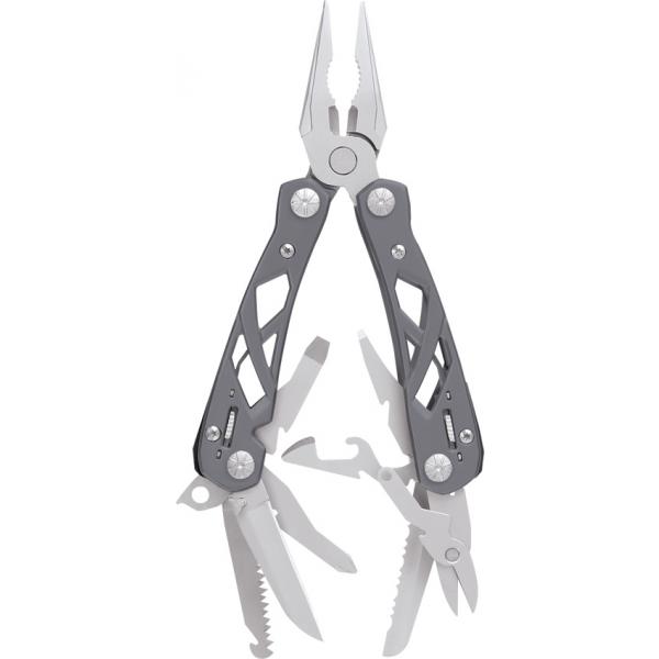 Pinze Suspension 22-01471 Gerber. Lunghezza totale 10 cm. Manico in acciaio. Comprende pinze ad ago caricate a molla, lama sheepsfoot seghettata, lama drop point, apriscatole, cacciavite grande, piccolo e micro, forbici, seghetto. Fodero balistico in nylon.rif scat 7
