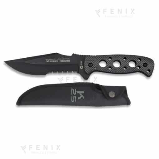 Il pugnale K25 con manico effetto carbonio forato è un coltello tattico compatto e performante, progettato per offrire massima precisione, resistenza e maneggevolezza in ogni situazione. Dotato di una lama fissa da 13,5 cm in acciaio inox rivestita in titanio, garantisce un taglio potente e duraturo anche nei contesti più difficili.