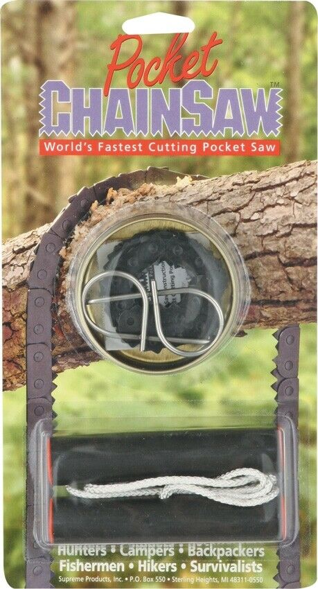 Sega Supreme PS1102 Pocket Chainsaw, chiusa misura 25cm, aperta 31cm. Realizzato in acciaio trattato termicamente ad alta resistenza e rivestito per resistenza alla ruggine. Lungo 71cm con 124 denti di taglio bidirezionali. Viene fornito con due maniglie.rif scat c