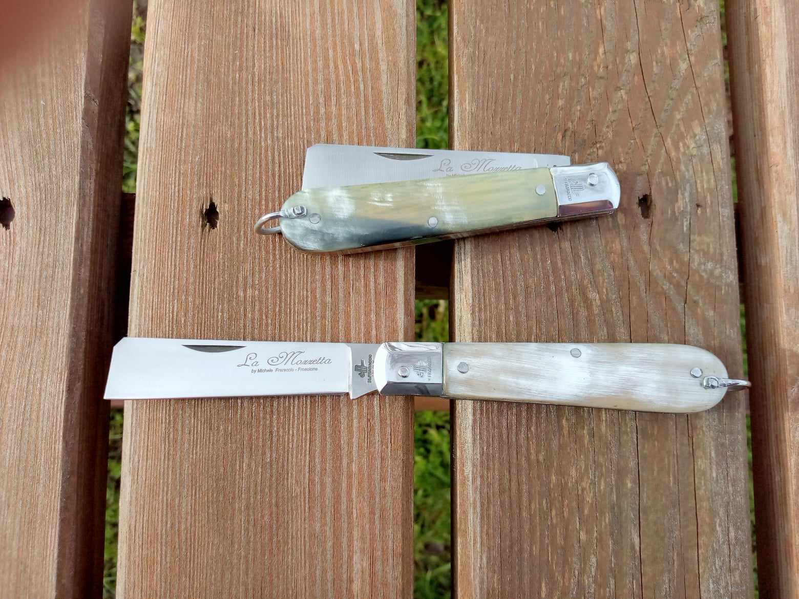 Coltello tradizionale La Mozzetta, prodotto artigianalmente dalla Coltelleria Michele Fraraccio di Frosolone.Chiuso misura cm. 10, aperto 18cm. Lama in acciaio inox 420 di 7 cm. Manico in corno bovino chiaro con testina inox e anello posteriore. Essendo il corno un materiale naturale le sfumature e il colore del manico variano da coltello a coltello, pertanto le foto del prodotto sono puramente indicative.