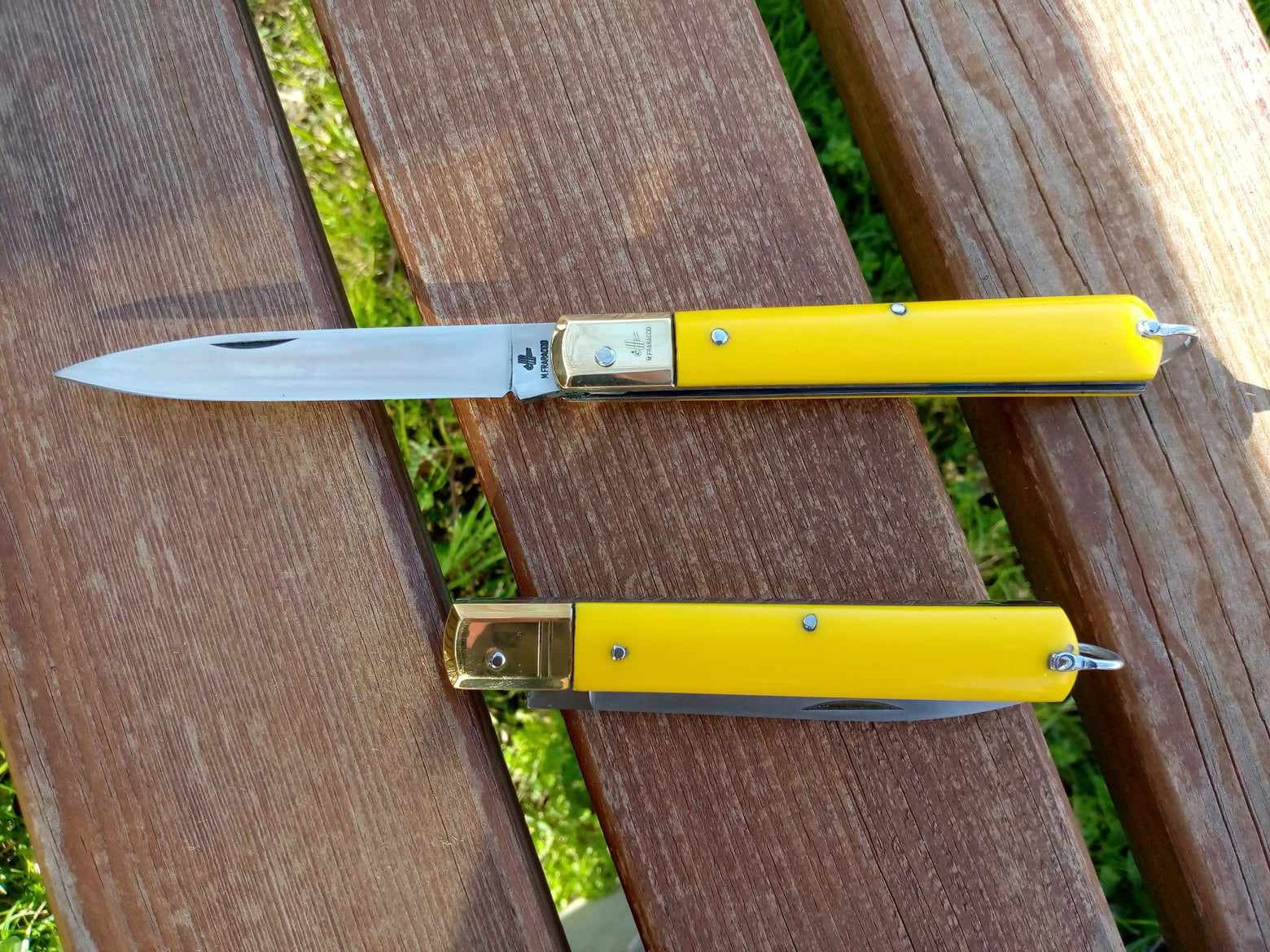 Coltello tradizionale Sfilato, prodotto artigianalmente dalla Coltelleria Michele Fraraccio di Frosolone. Chiuso misura cm 12, aperto 21.5cm Lama in acciaio inox 420 di 8.5cm Manico in ABS giallo con testina ottone e anello posteriore