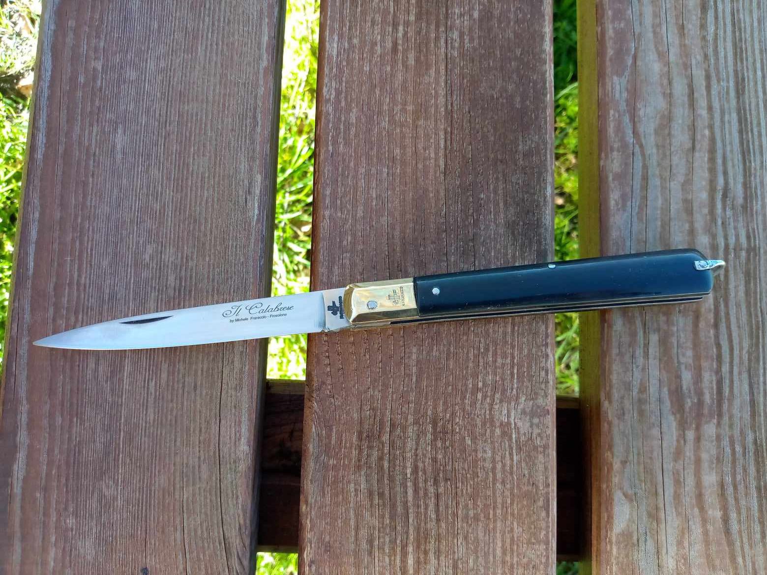 Coltello tradizionale Stiletto Il Calabrese, prodotto artigianalmente dalla Coltelleria Michele Fraraccio di Frosolone. Chiuso misura cm 12.5, aperto 23cm Lama in acciaio inox 420 di 10cm Manico in ABS nero con testina ottone e anello posteriore