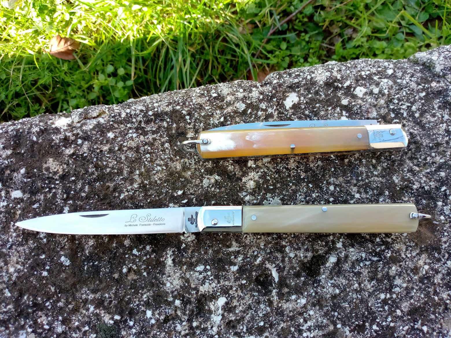 Coltello tradizionale Stiletto, prodotto artigianalmente dalla Coltelleria Michele Fraraccio di Frosolone. Chiuso misura cm 11.5 circa, aperto 21cm Lama in acciaio inox 420 di 9cm. Manico in corno bovino chiaro con testina inox e anello posteriore. Essendo il corno un materiale naturale, il colore e le sfumature cambiano da coltello a coltello, pertanto le foto sono puramente indicative.