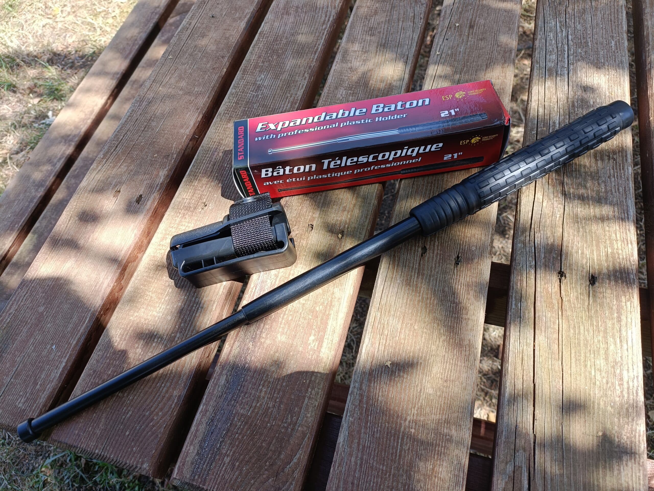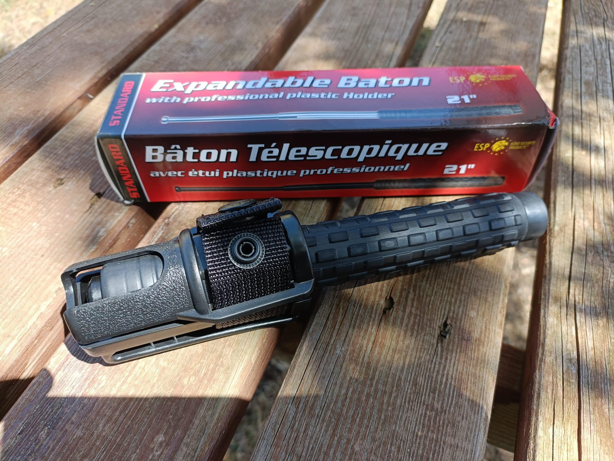 Una volta retratto, il bastone si richiude all’interno del manico, il quale ha un rivestimento in gomma nera.